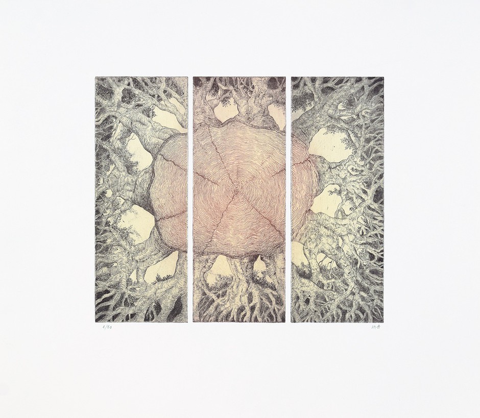 The artist has been developing a very personal mixed technique using charcoal, wood and wood. watercolor, pastel and watercolor; graphite (...). Symbol with the title “∞”, a symbol of infinity in some cultures, takes us to the cross-section of a tree with its spiraling circles from where new flowers seem to sprout that reach up to the top of the mountain. to heaven, combining the various cosmic levels and affirming the ascending vocation of living forms.