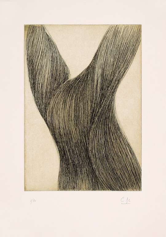Christine Enrègle, artista francesa nascida em 1973 e doutorada em artes plásticas, professora, vive entre Paris e Lisboa onde expôs os seus desenhos em 2020, na Sociedade Nacional de Belas Artes e, em 2022, no Museu Nacional de História Natural. O interesse pela natureza marca o seu percurso, considerada esta como uma matéria-prima cujos elementos transfigurados estão na origem das suas criações. Desde 2017 privilegia o desenho a carvão sobre tela criando formas orgânicas em relação com a metamorfose das plantas e com o crescimento das árvores e refletindo a simbiose entre o humano e o vegetal. Esgotada a gravura anterior, a atual série de gravuras, produzidas durante uma residência no Atelier CPS, mantém inspiração na Oliveira em trabalhos que realçam a importância e a mestria do desenho, expressão muito original da sua relação privilegiada com o vegetal, como metáfora do humano.