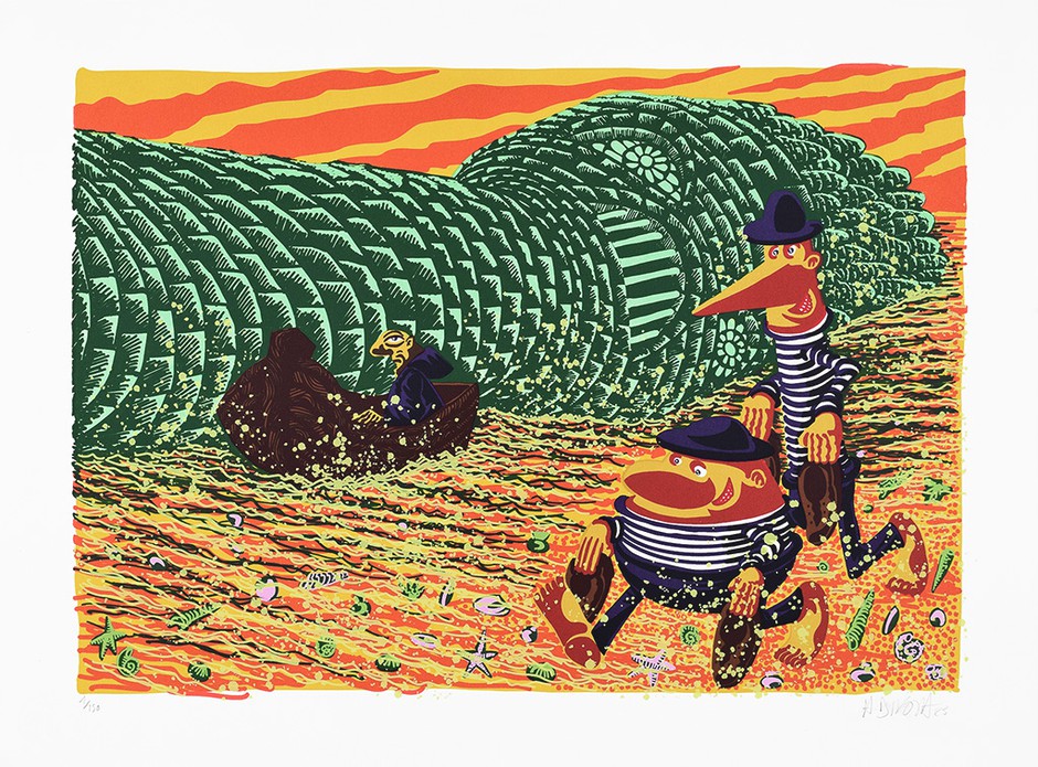 In his current creation for the CPS, the first screen print in the series "idols" that he developed in recent years “two wandering friends walk through ruins imaginary”, which he considers “an invisible archaeology”, precisely because from the sphere of the imaginary, although a reflection of iconic aspects of our civilization, evoked for example in the “ great buildings, in the form of an idol with many eyes and many limbs. In the present case, as he explains,“our wandering friends come across an idol stranded on the shore, the ruin of an ancient forgotten civilization, a proud civilization. which has now disappeared”. The artist perhaps intends in this way to show the precariousness of the principles inherent in the universe of power and arrogance imposed on many by the arrogance and injustice of very few.