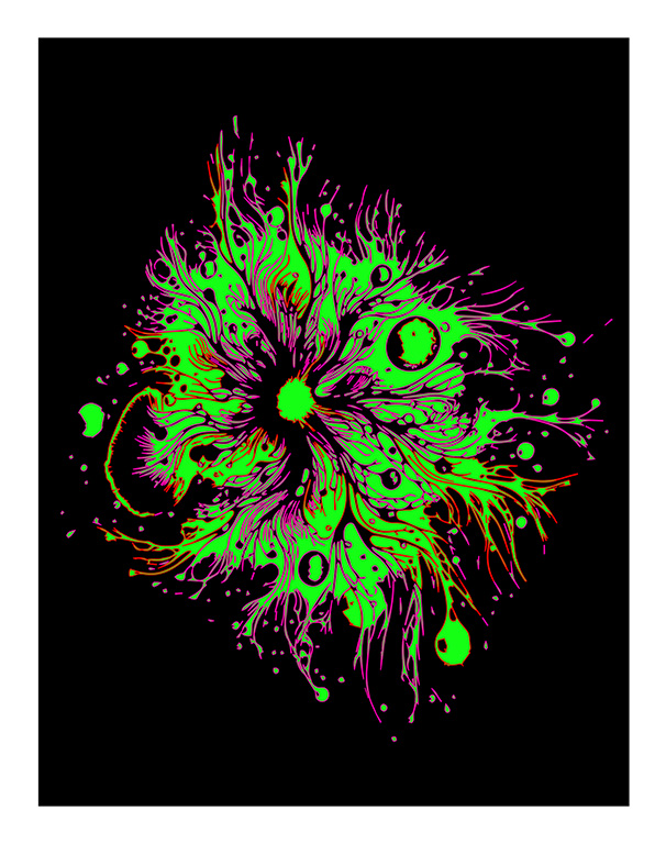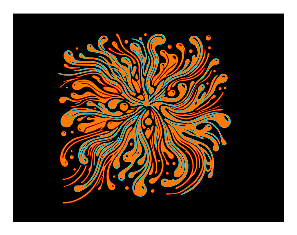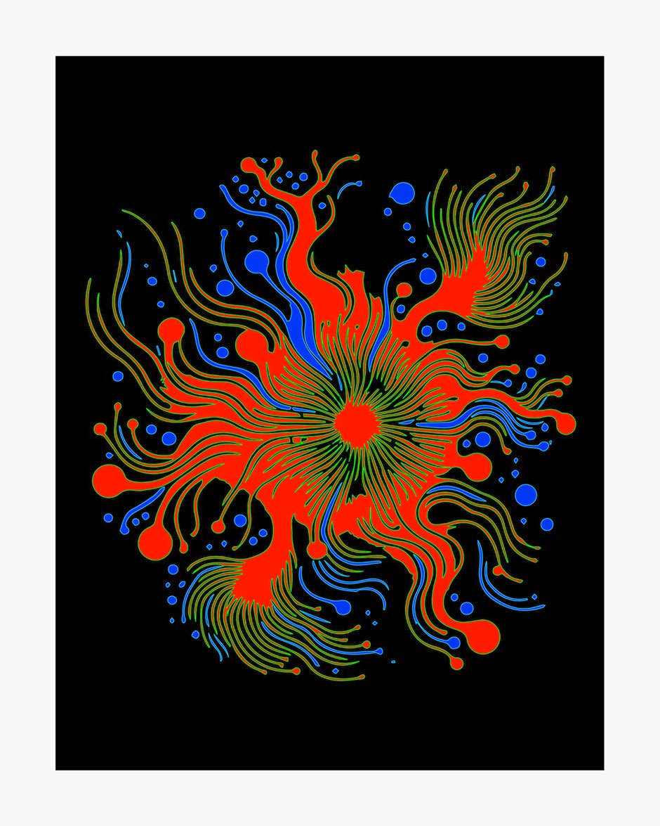 Na série "Splash 1 a 7", quis capturar um momento suspenso, aquele em que a água, a cor e a energia digital se fundem numa explosão de formas orgânicas. Estas obras nascem de um diálogo entre o mundo aquático e o universo virtual, como se a tecnologia permitisse à natureza reinventar-se. Os jatos sinuosos e os salpicos de vermelhos, azuis, laranjas ou verdes fluorescentes evocam simultaneamente algas, anémonas-do-mar ou fluxos em expansão. Cada serigrafia torna-se o espelho de um ecossistema imaginário, vibrante de bioluminescências artificiais, um mundo a meio caminho entre o vivo e o digital. Através desta série, continuo com a exploração da fronteira entre natureza e tecnologia: como é que as ferramentas digitais podem prolongar as forças vitais do mundo natural, dando-lhes novas formas, mais fluidas, mais luminosas e quase espirituais.