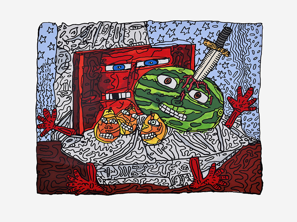 Robert Combas, “The Fruit Festival. Three pears, a watermelon and a wooden box! The wooden head broke a tooth eating bitter almonds”, screenprint, 56 × 69 cm, Edition of 100 copies, 2025