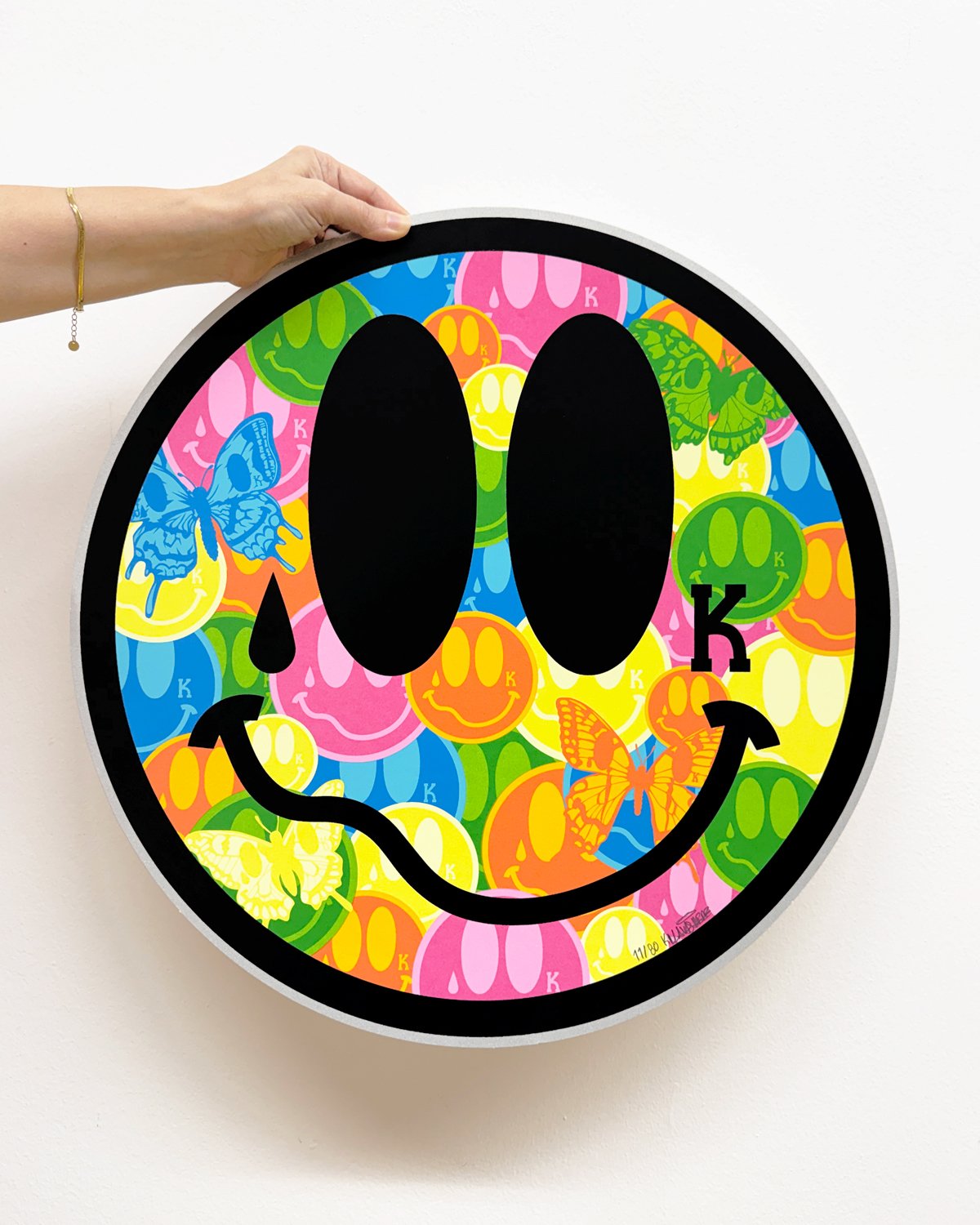 A serigrafia “Metamorfose Azul” associa-se à ideia de metamorfose, surgindo como símbolo de passagem entre estados, de evolução e de constante reconfiguração. Já “Killa Smile”, imagem recorrente no trabalho do artista, opera como um ícone ambíguo, cuja repetição e reinvenção acompanham essa lógica de mudança.