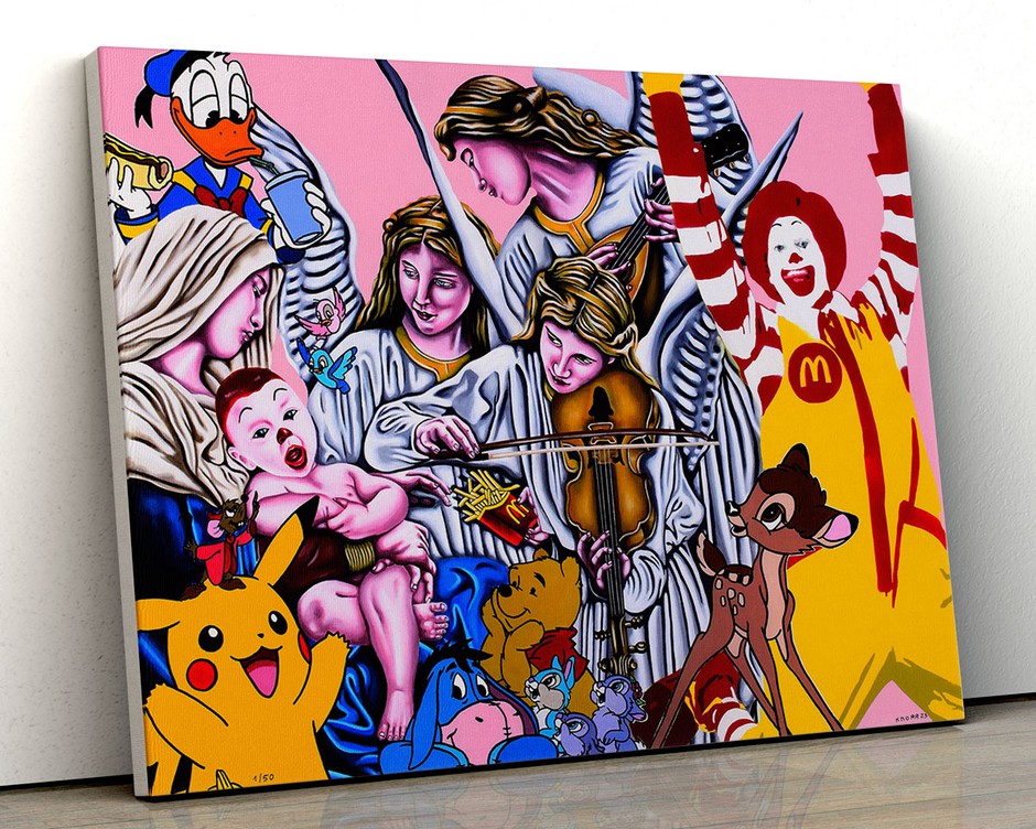 Carlos Knorr integra-se na tendência internacional da “street art” em ligação com um dos movimentos mais icónicos do século XX, a Pop Arte, ambos diretamente relacionados com a cultura de massas e a sociedade de consumo. O atual trabalho, uma estampa digital com o título: “The sequel of the birth of Ronald MacDonald’s Son”, realizada em 2021 funde a evocação de uma pintura académica bem conhecida, a “Canção dos Anjos” de Adolphe Bouguereau (1825-1905), com elementos contemporâneos. As figuras religiosas do quadro do conhecido pintor francês são aí substituídas por outras relativas ao mundo do palhaço Ronald McDonald, mascote da cadeia americana de fast food "McDonald's”. Personagens do desenho animado juntam-se a este universo de citações, marcada pelo humor, a fantasia e o nonsense. Mais uma notável criação do talentoso artista que nos leva a refletir sobre o sentido e os valores da sociedade nossa contemporânea.