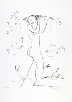 Conceituado artista plástico, autor das esculturas do Parque dos Poetas em Oeiras, apresenta-nos nesta serigrafia a leveza do seu desenho que as pombas assentuam e também a doçura sensual das linhas do corpo da mulher, motivo essencial do conjunto do seu trabalho.