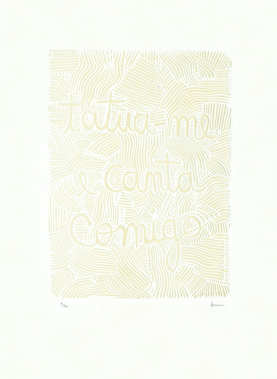 Isabel Barahona (Cascais, 1974), artista plástica, professora, tem uma formação em escultura, pintura, vidro e desenho (Ar.Co, 1993/96) e fez a Pós-graduação em Pintura na FBAUL (2005/06). Estudou pintura em Bruxelas e é Doutorada em Artes Visuais pela Universidade Politécnica de Valência. Em 2013, no contexto de um pós-doutoramento, foi bolseira da Universidade Rennes 2 onde desenvolveu uma investigação na origem do projeto de um arquivo on line sobre livros de artista e edição de autor em Portugal. Iniciou o seu percurso artístico em 2001 com uma exposição individual intitulada “mythologies tendo desde então participado em diversas mostras individuais e coletivas, em Portugal e no estrangeiro, entre as quais se destaca em 2018 a mostra coletiva com o título “Ar” no Museu Municipal de Faro. Vasco Vidigal que a seu respeito se pronunciou (Artadentro, Museu Municipal de Faro, 2009/2010) evoca a propósito da série apresentada em 2003 “tu es mon pays” a “memória do processo de fazer” que transforma a superfície pictórica numa “paisagem marcada e reveladora da ação do tempo”. Processo que se aprofunda posteriormente fazendo confluir no espaço de uma intimidade assumida, circunstâncias e fenómenos exteriores. (…) Esta espécie de “deriva introspetiva” passando a utilizar o desenho “como forma privilegiada de investigação e inventariação” da condição feminina. Numa relação sempre assumida entre as coordenadas líricas de um mundo íntimo e maravilhoso e uma realidade invasora e hostil. As quatro linóleogravuras que apresenta atualmente, uma interação entre escritas subjetivas de acentuada vertente lírica com fundos evocadores de impressões digitais refletem as suas preocupações e o seu percurso anteriores. As inscrições de palavras sobre a pele que parece simbolizar aqui o tecido subtil da alma: “agora aqui dizer-te tempo querer-te nós boca”, “tatua-me e canta comigo”, “agora aqui”, “dizer-te querer-te”, “tempo nós”, têm o sentido de um diálogo amoroso desejado e sempre interrompido por todas as vicissitudes exteriores que ameaçam a sua plenitude.
