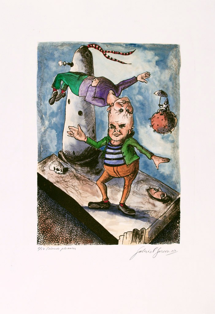 REALIDADE E FANTÁSTICO O jovem Gabriel Garcia cuja obra foi recentemente alvo de uma grande exposição na Galeria António Prates, afirma neste seu trabalho para litografia, o gosto pelo universo das fábulas, lição para os adultos desde Mestre Esopo e la Fontaine, numa figuração que funde a realidade e o fantástico, tal como no universo de Paula Rego, que pressentimos próximo.