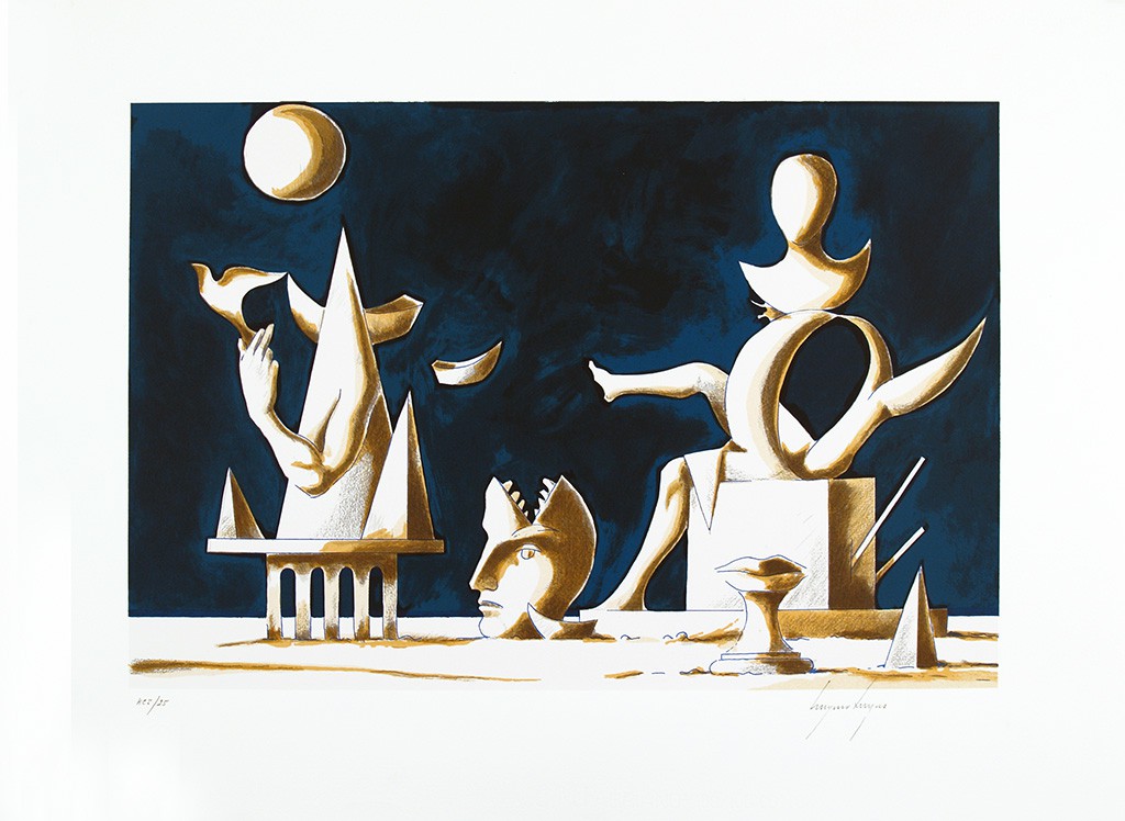 Sobre um azul ultramarino denso e profundo recortam-se com a nitidez imprecisa dos sonhos, neste trabalho de Cruzeiro Seixas, expoente do Surrealismo em Portugal, formas aladas e desconcertantes do universo da surpresa evocando os volumes da escultura, a que o artista nos habituou. Arquitecturas mágicas, levitações, beijos cristalizados num instante de pedra e silêncio, luas suspensas. Metáforas de uma civilização prisioneira em busca das fontes originais da liberdade, perdidas no dédalo dos mitos que alimentam a obra do pintor.