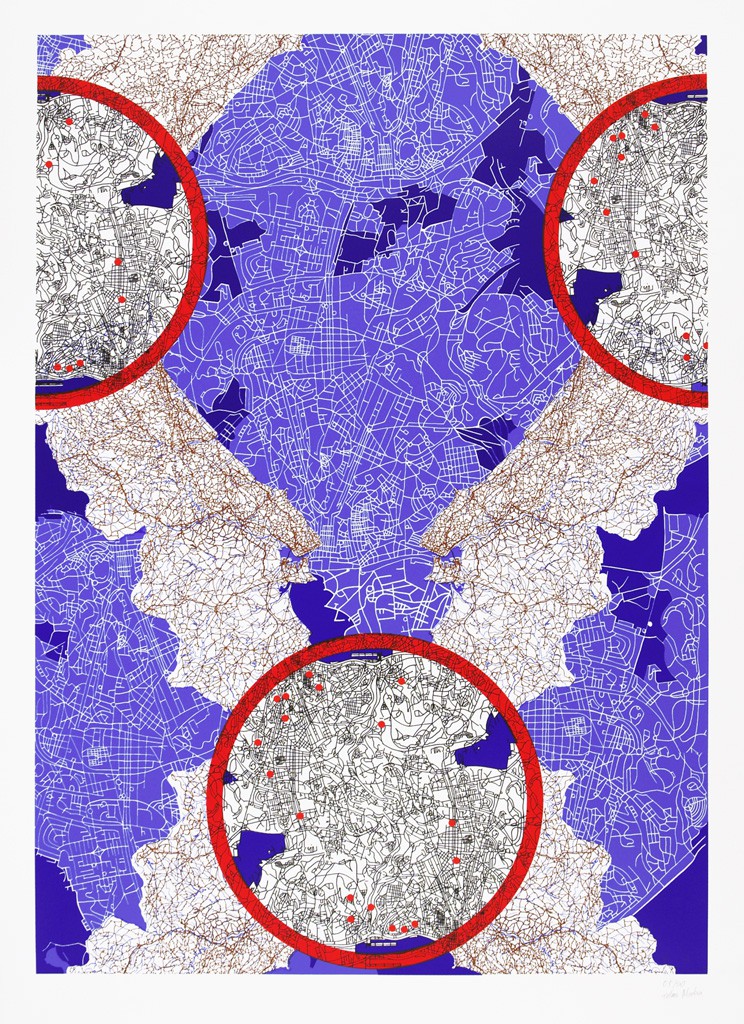 ITINERÁRIOS DA PRIMEIRA EDIÇÃO DO CPS Telmo Alcobia foi convidado pelo CPS, na celebração dos seus 25 anos a criar uma serigrafia que assinalasse a distribuição geográfica da sua primeira edição, a serigrafia “Le Petit Jardin” de Manuel Cargaleiro. O resultado foi o trabalho actualmente apresentado e acompanhado por um “caderno de exploração formal” onde o artista descreve o seu processo criativo. A cartografia resultante, sobrepondo-se ao mapa de Portugal, criou uma espécie de dédalo com destaque para núcleos assinalados a vermelho, de forte efeito visual.