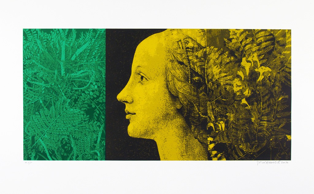 UM TEMA E VARIAÇÕES SOB O SIGNO DA RENASCENÇA José Nuno da Câmara Pereira achou no ideal de harmonia e de perfeição da Renascença, inspirado pela natureza, o modelo de uma beleza no feminino, enigmática e sedutora na metamorfose que a luz imprime ao perfil de uma serenidade quase irreal. A figura torna-se o écran das tonalidades que evocam os quatro elementos, dourada e azul emanação, entre a terra, o fogo, o ar e a água, verdadeiros motivos condutores do percurso de um artista que mostra a sua contemporaneidade precisamente na liberdade dos seus jogos com a imagem, esfíngico e poético limiar de uma invenção sempre renovada.