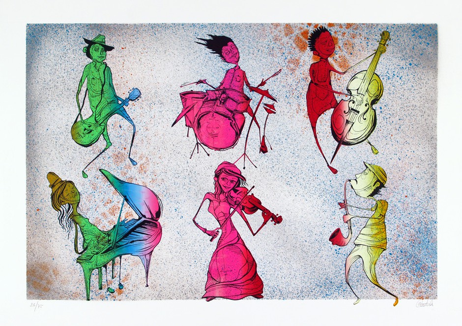 reflecte-se a sua apaixonada relação com a música, na temática escolhida, de tocadores de diversos instrumentos, bem como o talento para captar a especial vibração que as cores imprimem às linhas coleantes e