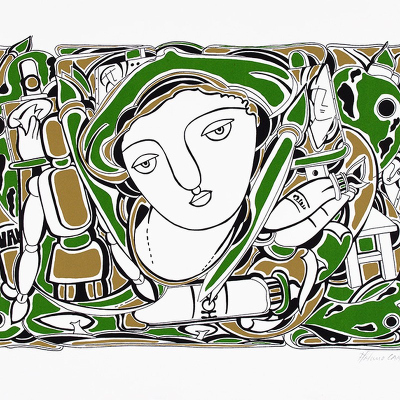 António Carmo (N. 1949) um dos pintores líricos mais emblemáticos do nosso país tem visto o seu trabalho impor-se igualmente num contexto internacional. Na serigrafia “Fotógrafo à la minute” retoma uma série de homenagens a figuras do imaginário popular que desenvolveu nos anos 80. Numa composição em que domina a habitual e forte presença da linha e do
