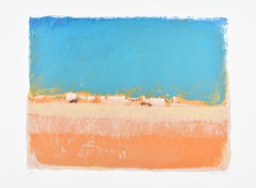 Rodrigo Ferreira que nasceu em Paris em 1951, há muito radicado em França onde fez a sua formação na Escola de Belas-Artes de Paris, filho do grande pintor e ilustrador Paulo Ferreira, habituou-nos ao exotismo das suas paisagens poéticas com cidades em ruínas perdidas na vastidão de espaços desérticos. Surpreende-nos hoje com a frescura da atmosfera solar de uma paisagem, certamente uma evocação das suas origens portuguesas. A respiração azul do espaço contrasta singularmente com a tonalidade rosada onde se recortam as minúsculas anotações de brancas arquitecturas, espécie de partitura plástica de esplêndido efeito visual. A realidade torna-se aqui metáfora de um desejo de evasão e de ruptura com um quotidiano que não permite a fusão com a natureza e o sentido de liberdade que nos transmite este espaço tocado pelo sol e transfigurado por uma beleza não apenas vivida, mas sonhada.