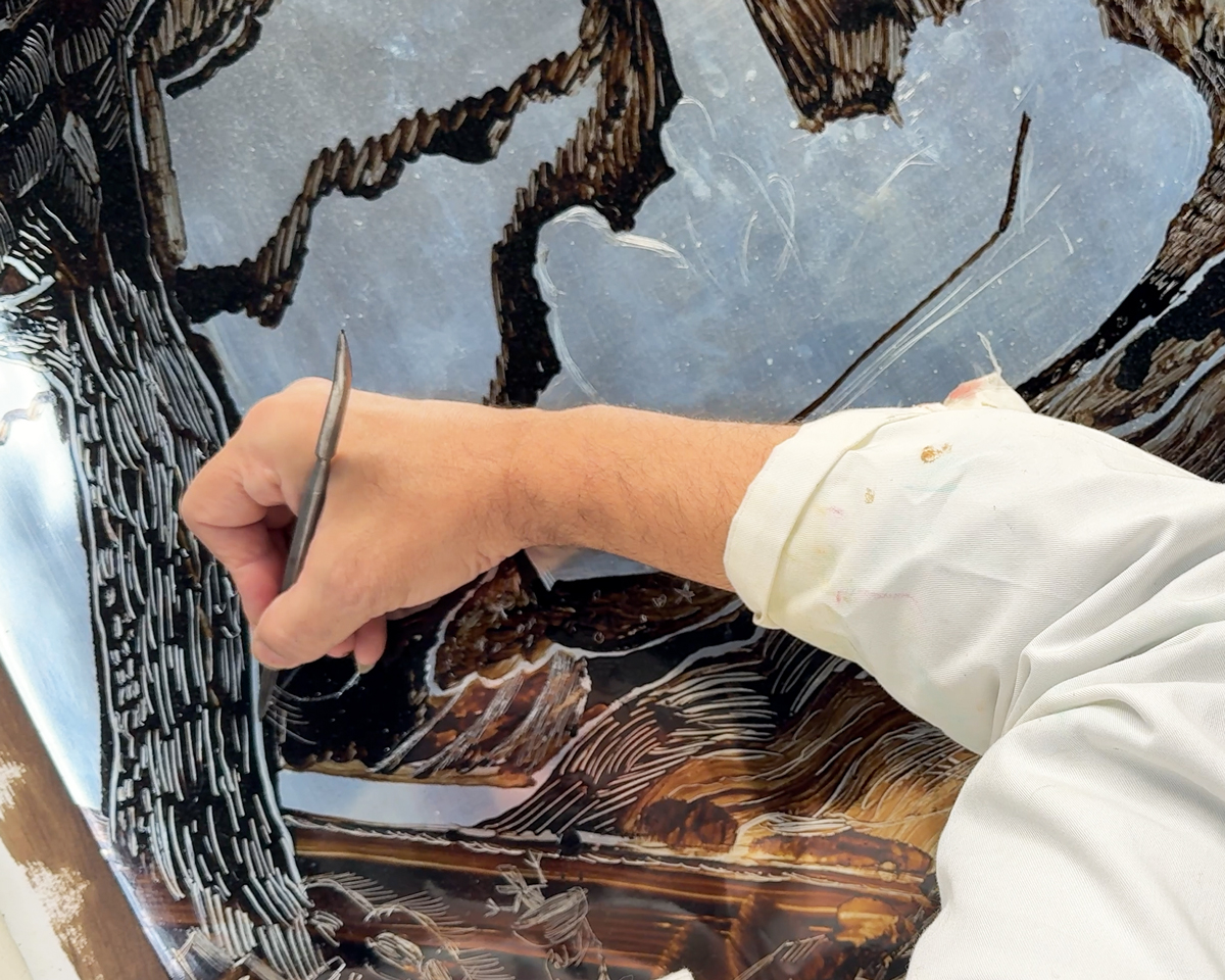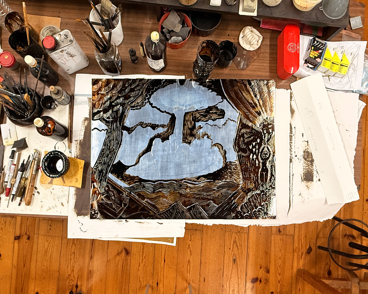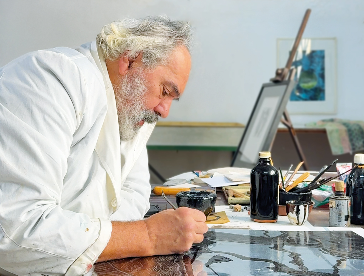 Manuel João Vieira no Atelier CPS, trabalha uma matriz de zinco para uma nova gravura, disponível brevemente.